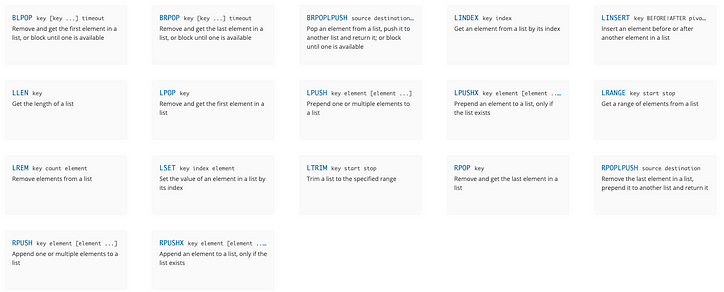Redis에는 삽입 순서로 정렬 된 문자열 목록 인 내장 목록 데이터 유형이 있습니다. 목록 LPUSH의 맨 앞 ( RPUSH) 또는 꼬리 ( )에 요소를 밀어 넣을 수 있습니다 .