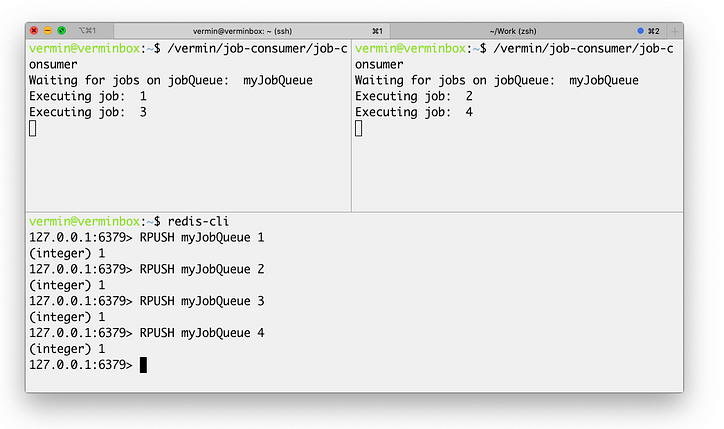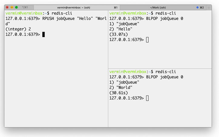 위와 같이 오른쪽에있는 두 개의 스택 터미널에서 실행했습니다. BLPOP jobQueue 0즉, 이름이 지정된 목록의 선두에서 POP를 실행 jobQueue하고 요소가 추가 될 때까지 영원히 기다립니다 (따라서 시간 제한 값 0).