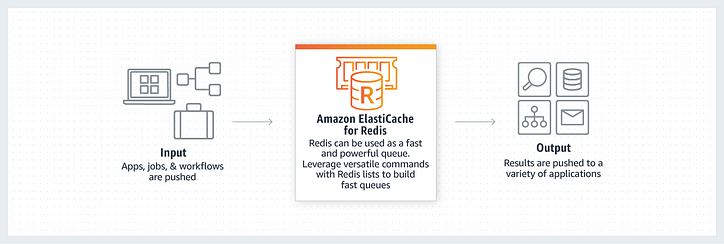 이 게시물에서는 기본 메시지 대기열 기능 을 구현 하기 위해 PUSH 및 POP 작업을 사용하는 방법을 살펴 봅니다 . AWS의 다음 다이어그램에 표시된 것처럼 메시지 대기열은 Redis 용 Amazon ElastiCache 의 사용 사례 중 하나 입니다.