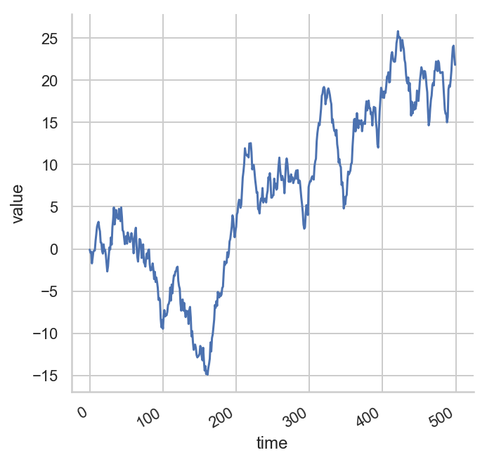 df = pd.DataFrame(dict(time=np.arange(500), value=np.random.randn(500).cumsum())) g = sns.relplot(x="time", y="value", kind="line", data=df) g.fig.autofmt_xdate()