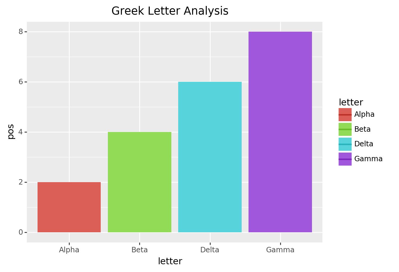 df2 = pd.DataFrame({ 'letter': ['Alpha', 'Beta', 'Delta', 'Gamma'] * 2, 'pos': [1, 2, 3, 4] * 2, 'num_of_letters': [5, 4, 5, 5] * 2 }) (ggplot(df2) + geom_col(aes(x='letter',y='pos', fill='letter')) + geom_line(aes(x='letter', y='num_of_letters', color='letter'), size=1) + scale_color_hue(l=0.45) # some contrast to make the lines stick out + ggtitle('Greek Letter Analysis') )