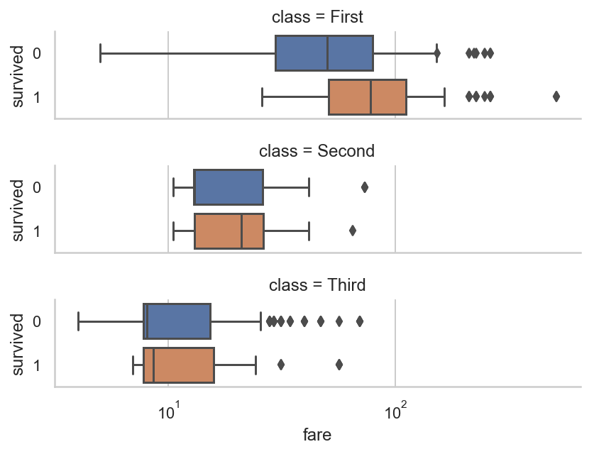 titanic = sns.load_dataset("titanic") g = sns.catplot(x="fare", y="survived", row="class", kind="box", orient="h", height=1.5, aspect=4, data=titanic.query("fare > 0")) g.set(xscale="log");