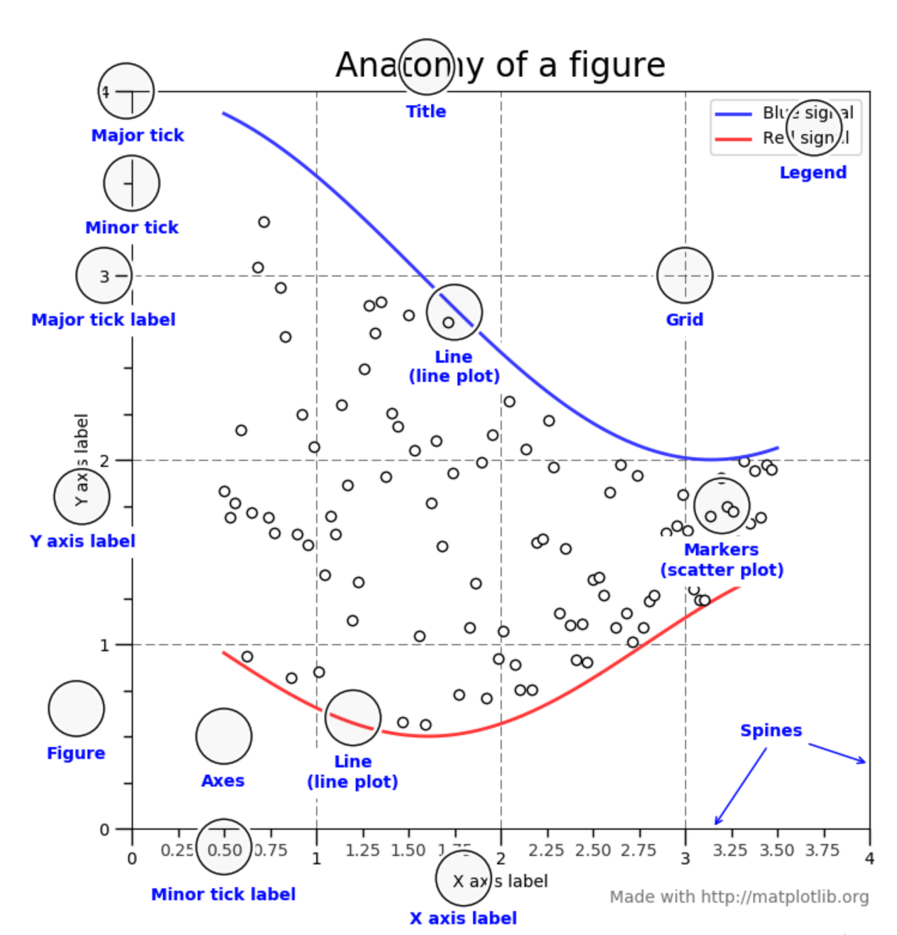 - 처음 matplotlib을 사용해 그래프를 그릴 때, 그래프와 관련된 명칭을 (영어 표현으로) 몰라 애를 먹었습니다